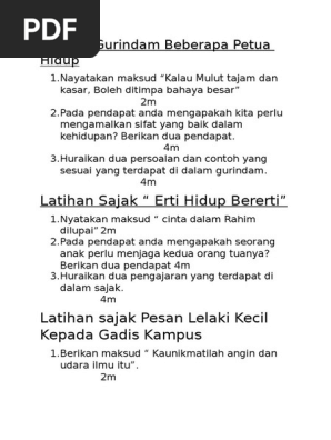 Komsas bab 5 nota pages 1 17 flip pdf download fliphtml5. Dari segi bentuk ia sama seperti talibun teromba atau mantera. Gurindam GURINDAM BEBERAPA PETUA HIDUP Zaba Maksud Rangkap 1 Peringatan kepada pembaca sekiranya kurang berfikir dan kurang menyelidik terlebih dahulu pasti akan menyebabkan hidup menjadi sesat.